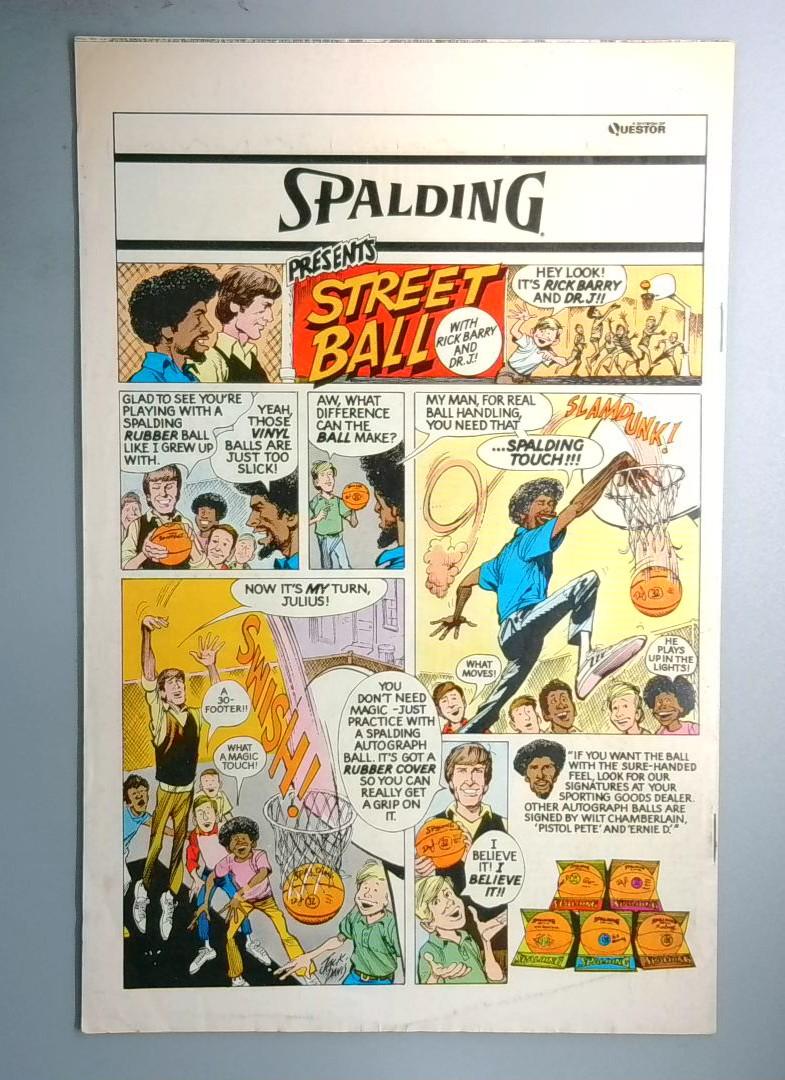 The issue includes a Spalding Street Ball advertisement featuring Rick Barry and Dr. J, showcasing the comic's vintage 1970s appeal and cultural touchstones of the era.