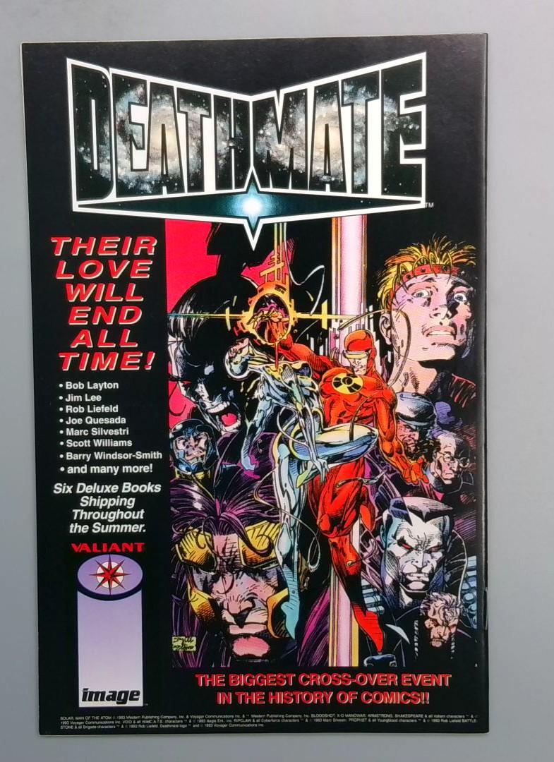 Deathmate #1 - Published by Valiant Comics as part of a major cross-over event, this promotional advertisement features the tagline "Their Love Will End All Time!" and announces six deluxe books shipping throughout the summer.