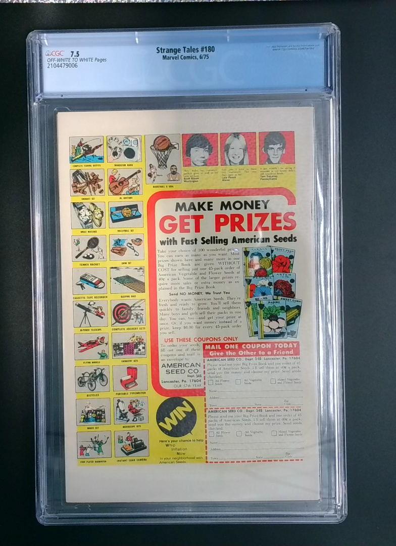 Strange Tales #180 features a dramatic "Judgment Day!" cover showcasing Warlock, a cosmic Marvel character, battling a massive green monster with a skull in the background. This issue highlights Warlock's complex storylines during Jim Starlin's legendary cosmic Marvel run, presenting a visually striking confrontation that epitomizes the character's mystical and science fiction elements. The bold red and green color palette creates a striking visual impact, emphasizing the high-stakes cosmic conflict. CGC graded 7.5, this comic is preserved in a professional-grade protective slab, maintaining its collectible condition and preservation.