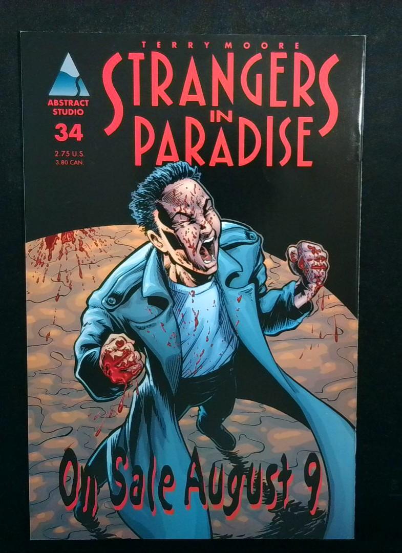 Strangers in Paradise #33–34 from Terry Moore’s acclaimed creator-owned series, blending romance, noir and crime as it follows Katchoo, Francine and their tangled relationships and dangerous entanglements. Issue #33 features a bold, minimalist golden "SP" emblem cover with the "When Worlds Collide" tagline, while #34 offers a striking, violent image with "On Sale August 9" — both published by Abstract Studio with covers by Terry Moore.
