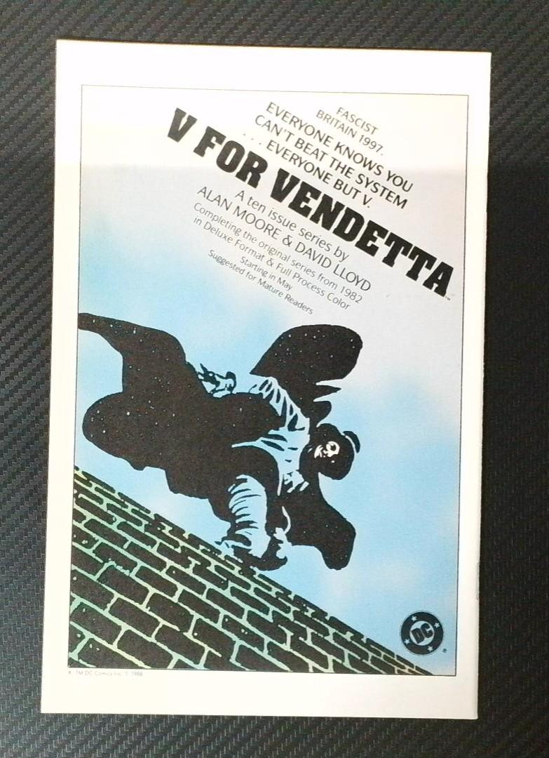 The back cover advertisement promotes "V for Vendetta," a ten-issue limited series collecting material from the acclaimed work by Alan Moore and David Lloyd, originally serialized in single magazine format and later presented in deluxe format.