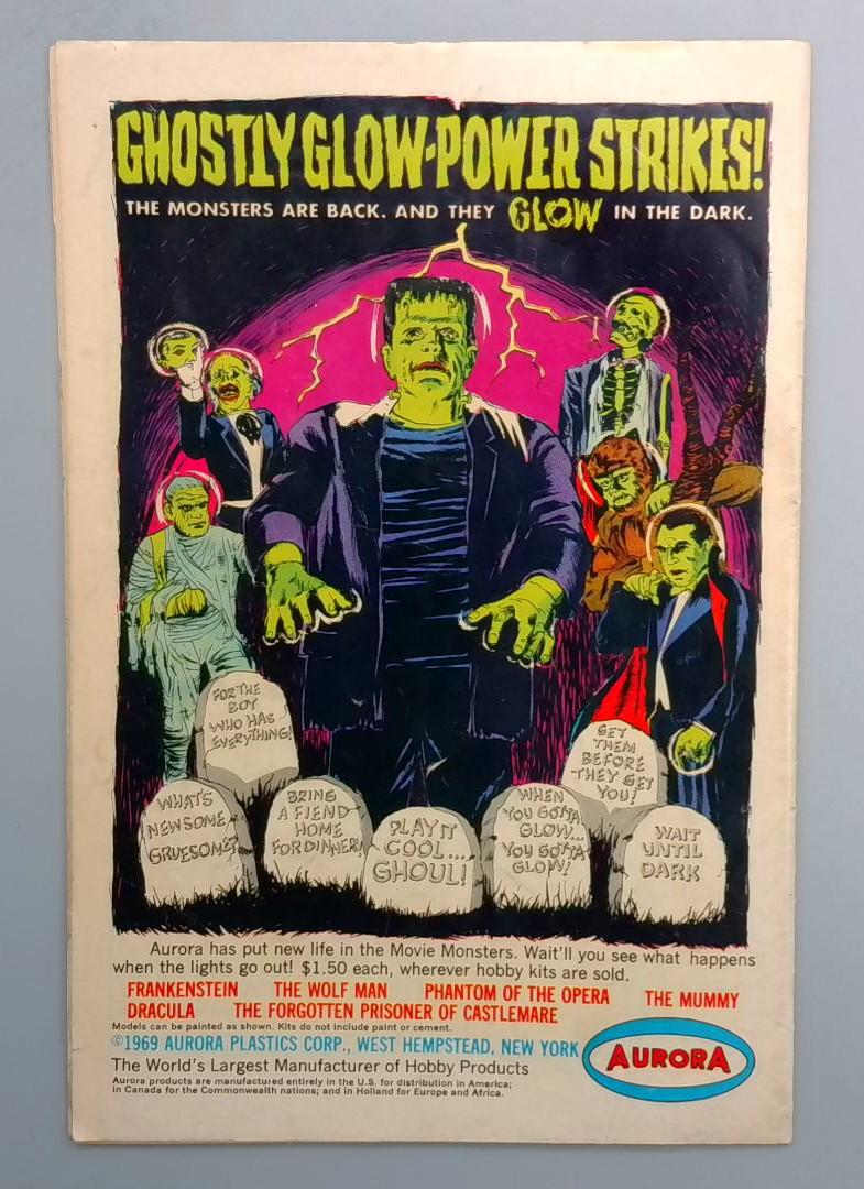 Bonus Content: Inside back cover features an Aurora Plastics advertisement for their glow-in-the-dark Movie Monsters model kits, including Frankenstein, The Wolf Man, Phantom of the Opera, The Mummy, Dracula, The Forgotten Prisoner of Castlemare, and other classic Universal monsters.