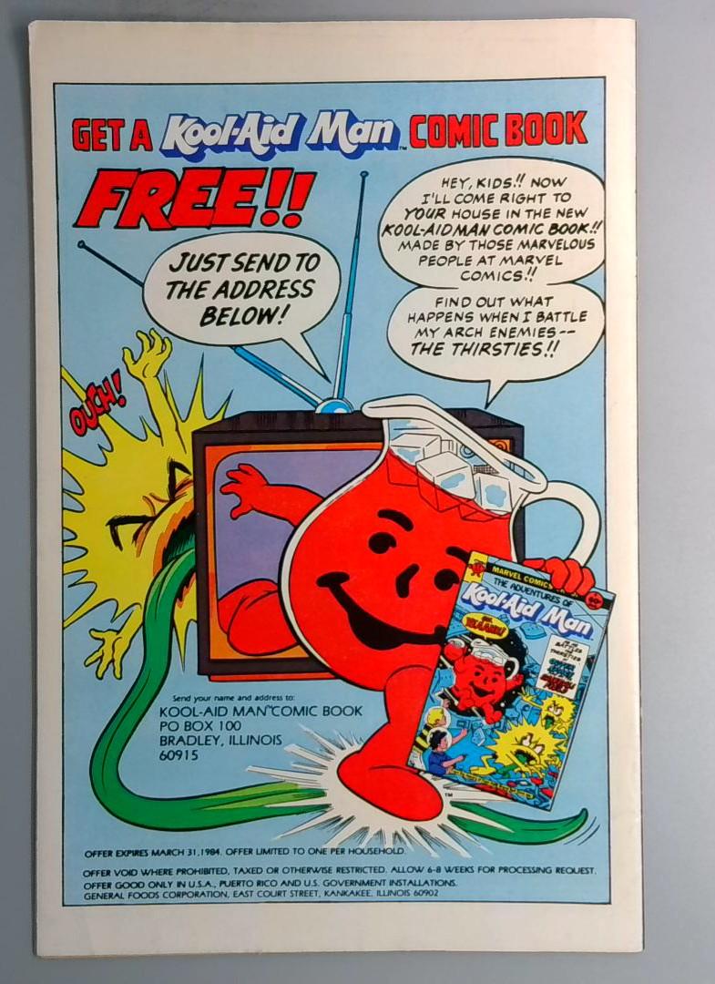 The back cover includes a vintage Kool-Aid Man promotional advertisement offering a free Marvel Comics tie-in comic book, a classic example of 1980s cross-promotional marketing that appeared in many Marvel titles of the era.