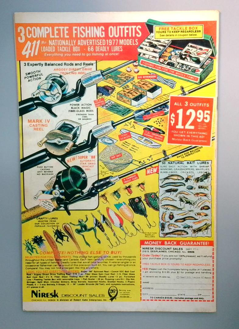 This issue also includes a vintage fishing outfits advertisement featuring 3 complete fishing sets by Niresk Discount Sales, a common and charming artifact of 1970s comic book publishing.