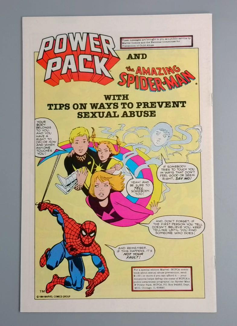 Uncanny X-Men #207 from July 1986 features a striking cover of Wolverine in his classic yellow and black costume, with a dynamic pose highlighting his signature adamantium claws. This issue is part of Marvel's 25th Anniversary celebration, as noted by the commemorative logo on the cover. The artwork showcases the character's intense and fierce persona, typical of the mid-1980s X-Men era. The second image is a public service comic about preventing sexual abuse, featuring Spider-Man and Power Pack, which appears to be an educational outreach publication aimed at raising awareness among children about personal safety.
