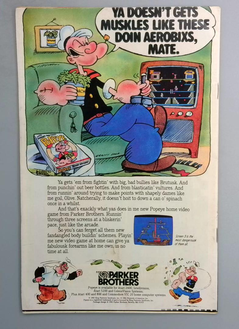 The issue also contains a vintage advertisement for the Popeye video game by Parker Brothers, promoting gameplay across multiple home gaming systems including Atari 2600, Intellivision, Atari 5200, ColecoVision, Atari 400, Atari 800, and Commodore VIC-20 platforms—a snapshot of 1980s gaming culture.
