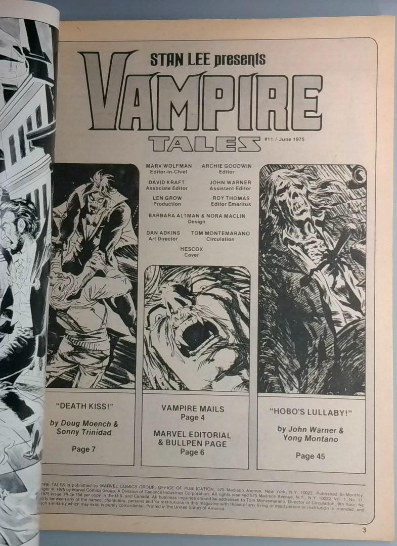 Vampire Tales #11 - Marvel Comics, June 1975. Presented by Stan Lee, this horror anthology series brings "Nightmare Legends of the Living Dead" to readers with a classic Hescox cover illustration.