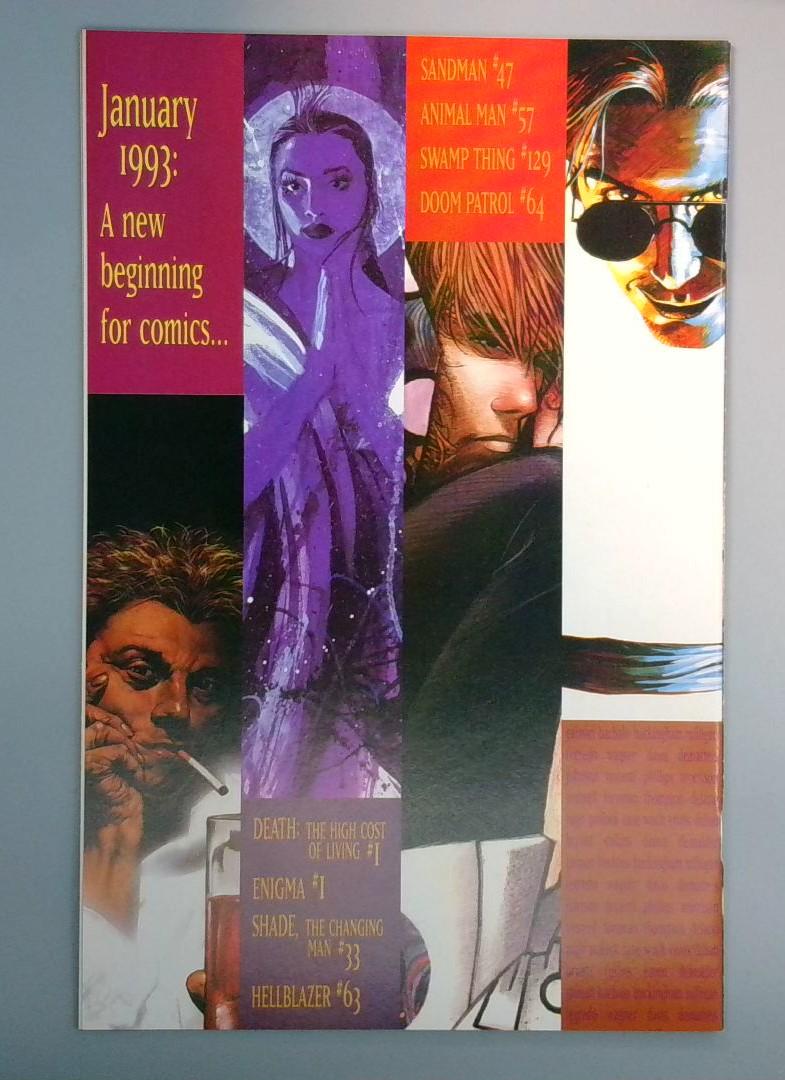 This landmark preview issue showcases the innovative and dangerous comic line that would define DC's adult-oriented publishing. Featuring an exclusive Sandman story by Neil Gaiman and Williams, alongside previews of Animal Man #57, Swamp Thing #129, and Doom Patrol #64, plus announcements for upcoming series including Death: The High Cost of Living, Enigma, Shade, The Changing Man, and Hellblazer. The vibrant, multi-panel cover design captures the edgy aesthetic that would come to define Vertigo.