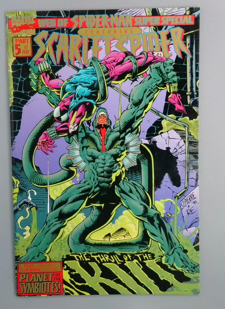 Web of Spider-Man #101 features the "Planet of the Symbiotes" storyline, showcasing Carnage in a dramatic, fiery red and white cover. The issue depicts a high-stakes battle between Spider-Man and symbiote characters, with dynamic artwork highlighting the intense confrontation. This comic is part of a larger crossover event exploring the symbiote mythology in the Marvel Universe. Web of Spider-Man Super Special #1 focuses on Scarlet Spider, presenting a visually striking green and pink cover featuring a complex, contorted symbiote-related character. The issue is part 5 of 5 in the "Planet of the Symbiotes" storyline, offering a climactic conclusion to the symbiote narrative with intricate, detailed artwork characteristic of 1990s comic book style.