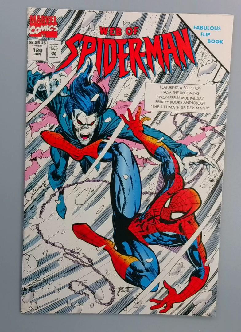 Web of Spider-Man #120 (Jan 1994) begins the "Web of Life" story arc, pitching the Scarlet Spider, the mystery man called Kaine, and the Grim Hunter into a collision with Destiny. The issue teases escalating ties to Peter Parker's past and ramps up the Scarlet Spider's role in the storyline. Cover copy notes this is a "Fabulous Flip Book" and includes a selection tied to an upcoming Ultimate Spider-Man anthology.