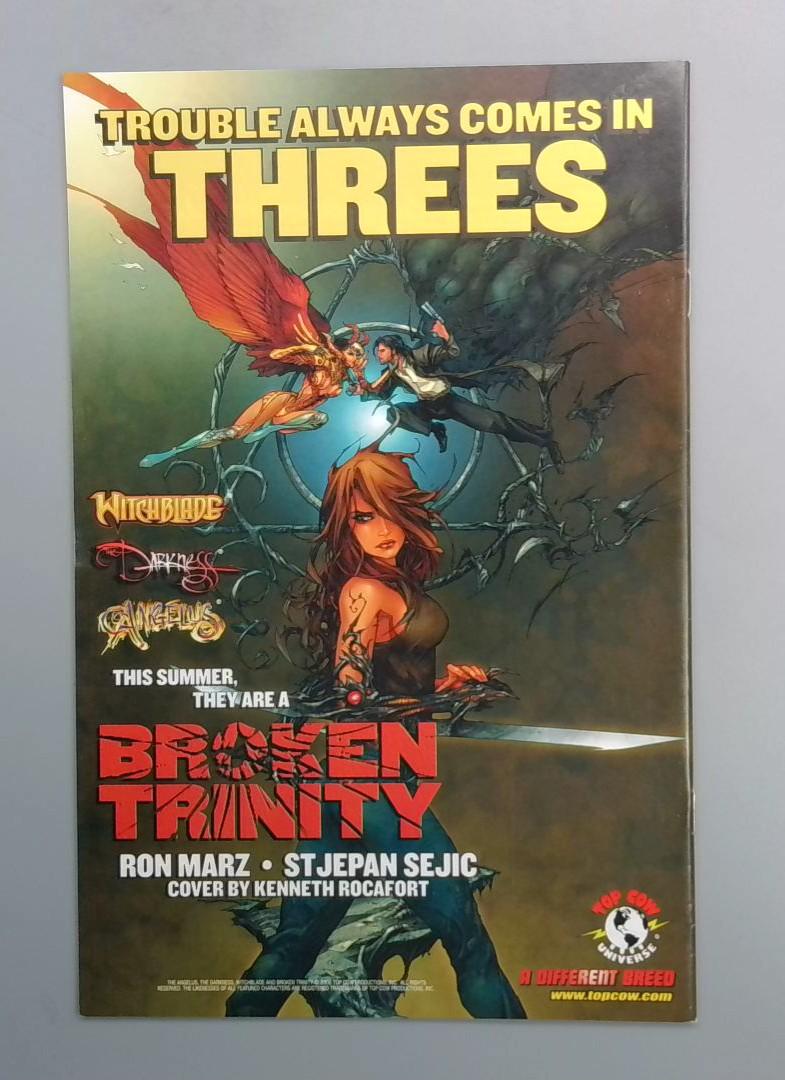 The promotional back cover emphasizes the crossover potential with the tagline "Trouble Always Comes in Threes," teasing the convergence of Witchblade, Darkness, and Angelus characters in this major story arc.