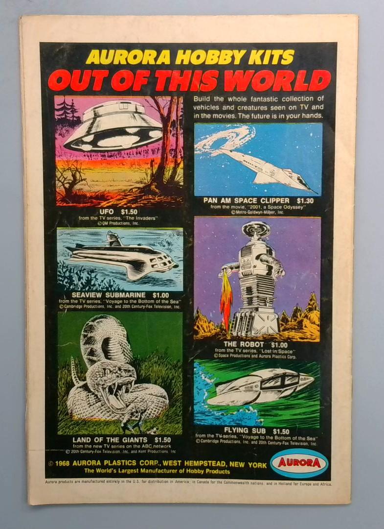 This issue also includes period advertising, notably an Aurora Hobby Kits advertisement promoting science fiction model kits from popular television shows and films, including UFOs, space vehicles, and robots—capturing the space-age enthusiasm of the late 1960s.