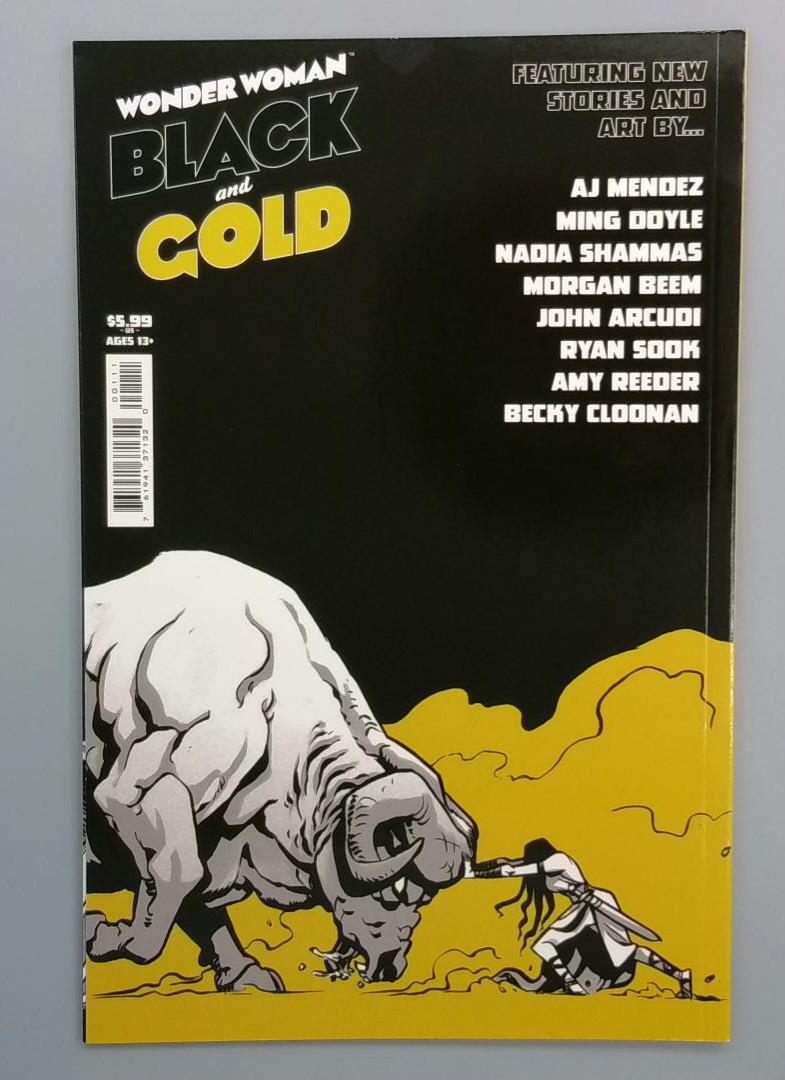 "Wonder Woman: Black and Gold" is a special anthology issue featuring new stories and art by a diverse lineup of talented creators including AJ Mendez, Ming Doyle, Nadia Shammas, and others. The comic presents a unique black, white, and yellow color palette, offering a stylized take on Wonder Woman's world. The cover showcases Wonder Woman with her signature lasso, rendered in a striking monochromatic design with selective yellow highlights, while the back cover features an intense scene with a powerful creature confronting a smaller figure. This issue promises innovative storytelling and artistic interpretations of the iconic superhero from a range of creative perspectives.