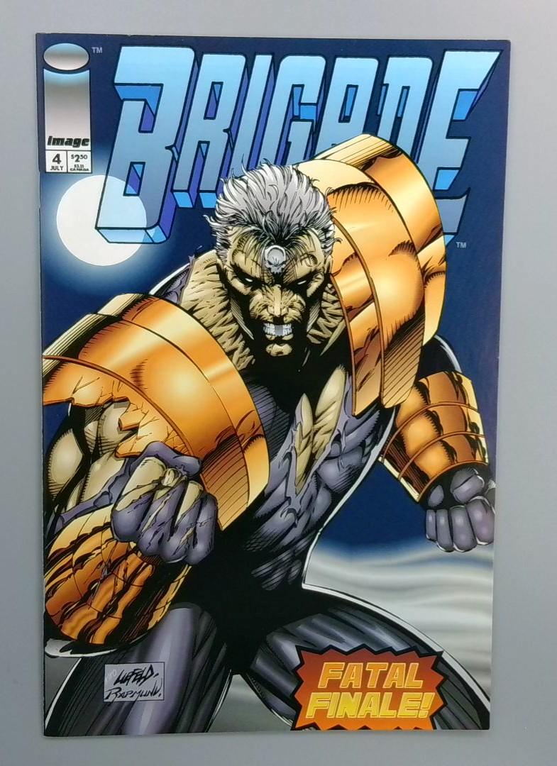Youngblood #5 — High-energy Image/Extreme Studios team book featuring Youngblood as they face escalating threats and the consequences of being a government-sponsored superhero team. Story continues the series' mix of action, political pressure, and interpersonal conflict among team members. Cover art by Rob Liefeld showcases a menacing close-up and the bold "Let's Rock!" callout, exemplifying early‑90s Image style. Brigade #4 — Concluding the early Brigade arc with a "Fatal Finale" showdown as the superteam confronts a major adversary and the fallout of their missions. Emphasizes large‑scale action and character drama typical of Liefeld's creator‑owned team books. Cover art credited to Rob Liefeld and his studio, featuring the armored team leader in dynamic pose.