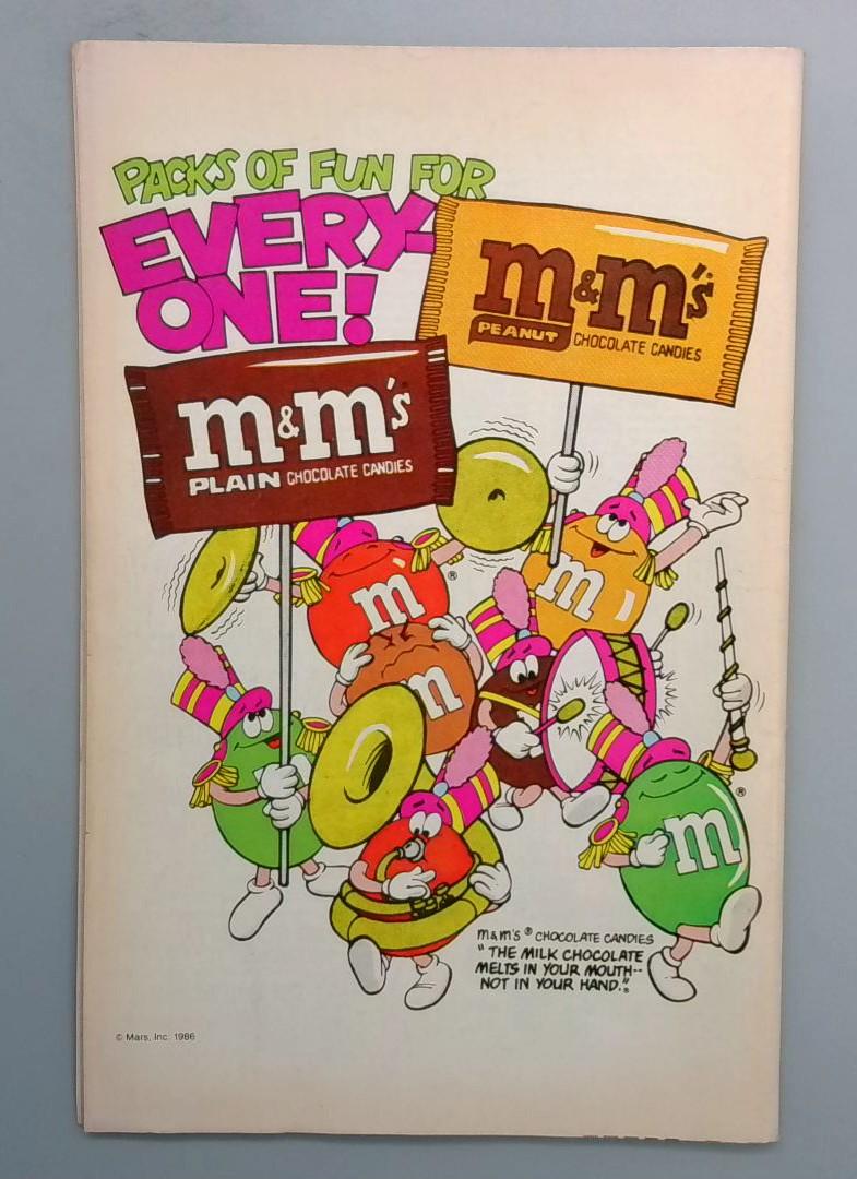 The back cover advertisement showcases M&M's chocolate candies from 1986, featuring the colorful M&M characters in a playful scene promoting their product line.