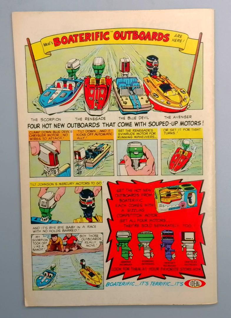 The interior includes a vintage advertisement for Ideal's "Boaterific" outboard motors, showcasing four different toy motorboat models: The Scorpion, The Renegade, The Blue Devil, and The Avenger, each featuring detailed mechanical features and racing action.