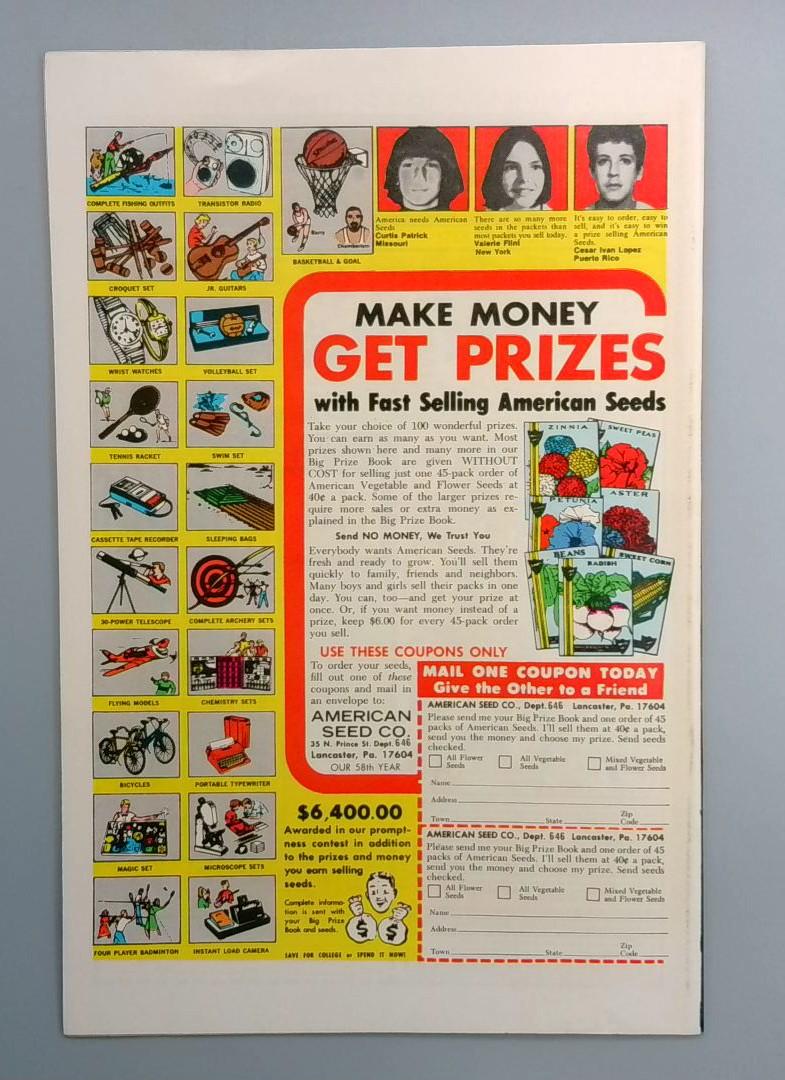 The back cover includes a vintage advertisement for American Seed Company's prize giveaway promotion, offering prizes and money for selling seeds—a classic element of comics from this era that adds historical charm and authenticity to the complete reading experience.