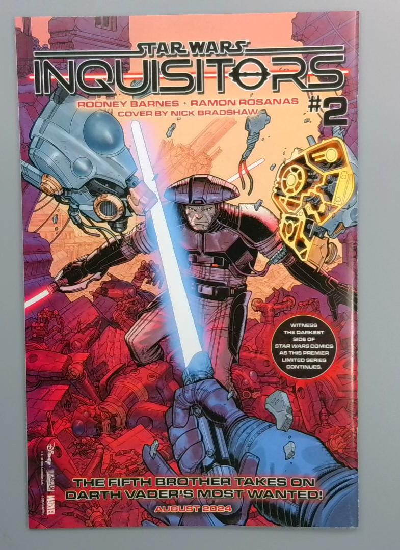 Star Wars: Ahsoka #1 - A Marvel comic featuring Ahsoka Tano in her iconic armor, showcasing a variant edition cover. The issue likely explores Ahsoka's adventures following her appearance in the Star Wars Disney+ series, capturing her unique character design and continued storyline in the Star Wars universe. Star Wars: Inquisitors #2 - A Marvel comic focusing on the Fifth Brother, an Imperial Inquisitor, battling against Darth Vader's most wanted targets. The issue promises to delve into the dark side of Star Wars comics, featuring intense action and exploration of the Inquisitors' role in the galactic conflict. The cover by Nick Bradshaw highlights the high-stakes confrontation and sci-fi technological elements.