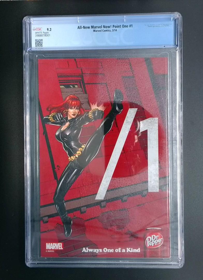 All-New Marvel Now! Point One #1 introduces readers to a dynamic lineup of Marvel heroes, showcasing potential new storylines and character developments. The issue features a vibrant cover with multiple heroes including Ms. Marvel, Silver Surfer, and other Marvel characters in an action-packed scene. This anthology-style comic provides a glimpse into upcoming Marvel narratives and serves as a jumping-on point for new readers interested in the Marvel universe. CGC Universal Grade comic graded 9.2, indicating a near-mint condition with minimal wear.
