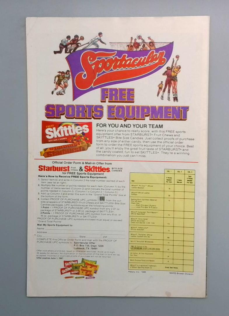 This 25th Anniversary celebration issue features a striking cover showcasing Spider-Man's iconic mask in bold blue and black against a vibrant green background, surrounded by an impressive array of Marvel characters and villains. This newsstand edition includes a vintage Starburst/Skittles sports equipment mail-in promotion offer, making it a fun piece of 1980s comic book memorabilia.