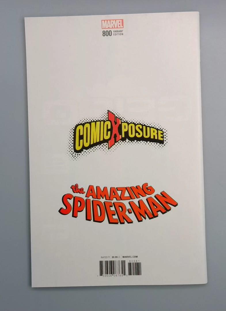 Amazing Spider-Man #800 features a dramatic variant cover showcasing Spider-Man alongside Black Cat and a menacing red and black symbiote-like creature against a city backdrop. This landmark issue is part of a significant storyline involving multiple Spider-Man characters and potential symbiote-related threats. The artwork highlights intense action and dynamic character interactions, promising a high-stakes narrative for Spider-Man fans. The Comic Xposure variant cover adds additional collectible appeal to this milestone issue.