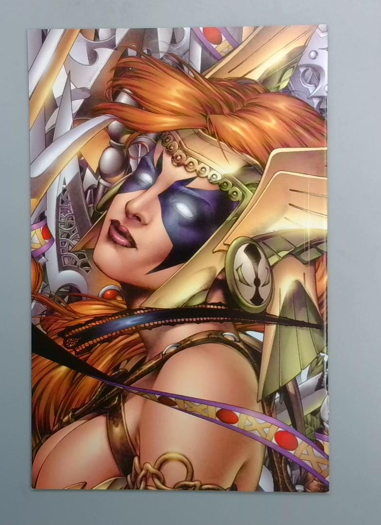 The second image shows an interior or variant cover featuring the character in elaborate golden armor and a mechanical eye piece, with flowing orange-red hair and ornate technological details surrounding her. The rich, detailed artwork showcases vibrant colors and dynamic composition typical of Image Comics' high-quality productions from this era.