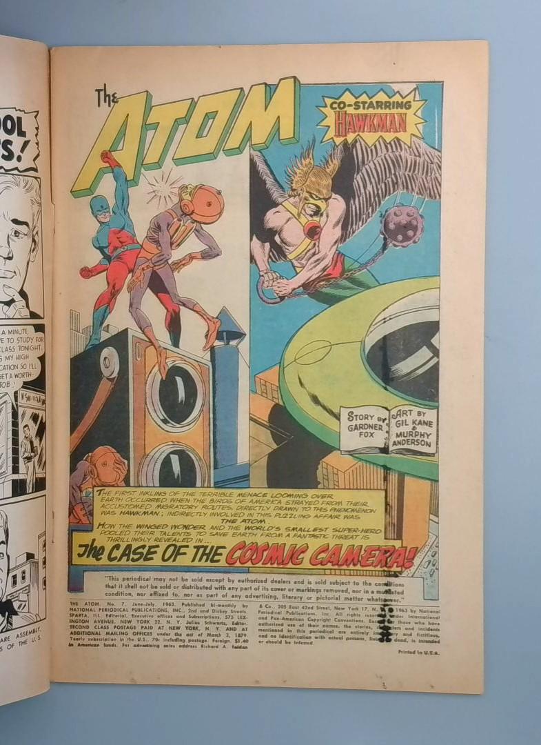 The Atom #7 from July 1963 features the first team-up of The Atom and Hawkman in "Case of the Cosmic Camera!" This issue is billed as starring "The World's Smallest Super-Hero" and introduces a super-powered adventure involving a mysterious cosmic device. The comic showcases dynamic artwork by Gil Kane and Murphy Anderson, with a story by Gardner Fox, presenting an exciting sci-fi superhero narrative typical of the Silver Age of comics.