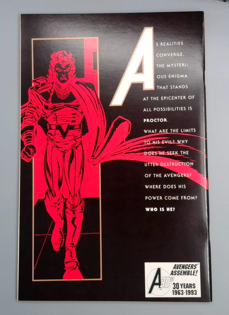 Avengers #360 - "Alternate Visions" commemorates the 30th anniversary of the Avengers. This issue explores mysterious themes around the character Proctor, questioning his origins, motivations, and enigmatic power. The cover features a dramatic, embossed silver image of a powerful figure, highlighting the cosmic and mystical elements of the storyline. This special anniversary issue delves into the convergence of multiple realities and the complex narrative surrounding Proctor's relationship with the Avengers.