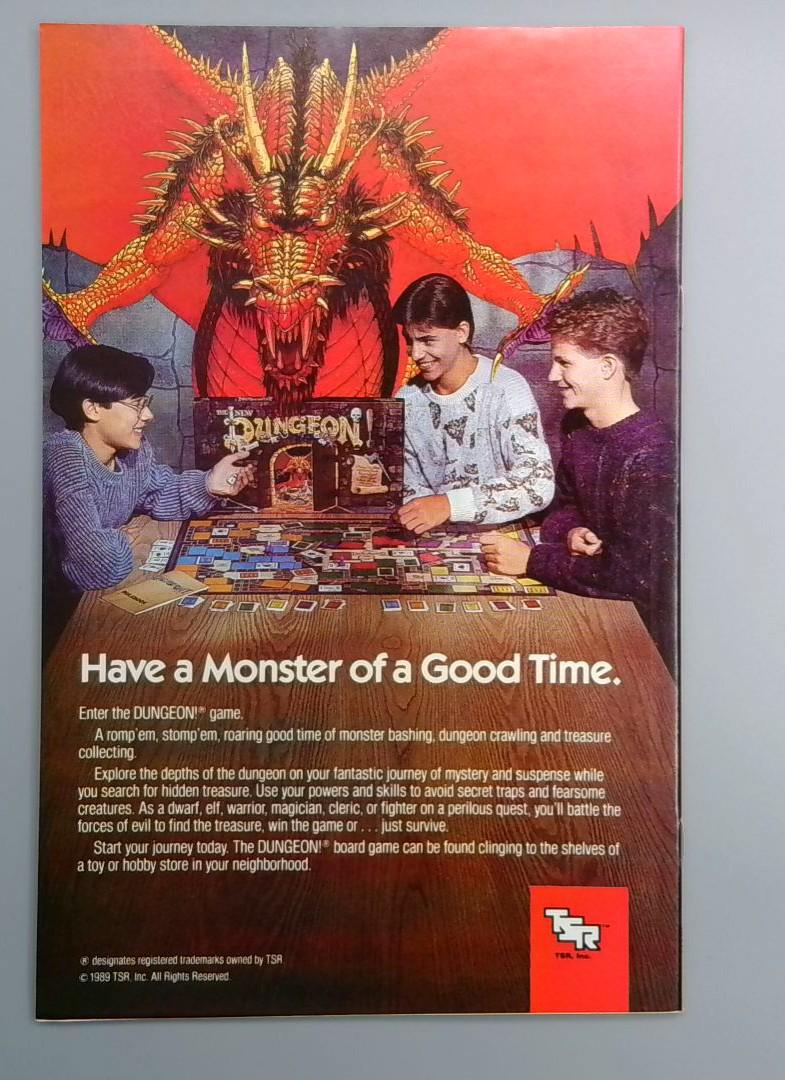 Bonus Insert: Back cover features a full-color advertisement for the classic DUNGEON! board game by TSR, Inc. (1989), promoting the dungeon-crawling tabletop experience with the tagline "Have a Monster of a Good Time."