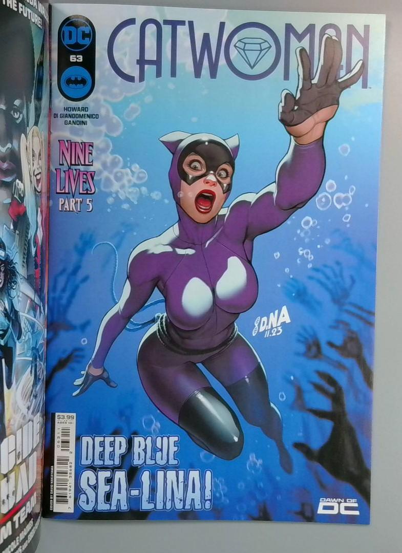 Keywords: Catwoman DC Comics Nine Lives comic book underwater adventure dynamic artwork purple costume superhero vibrant colors action scene