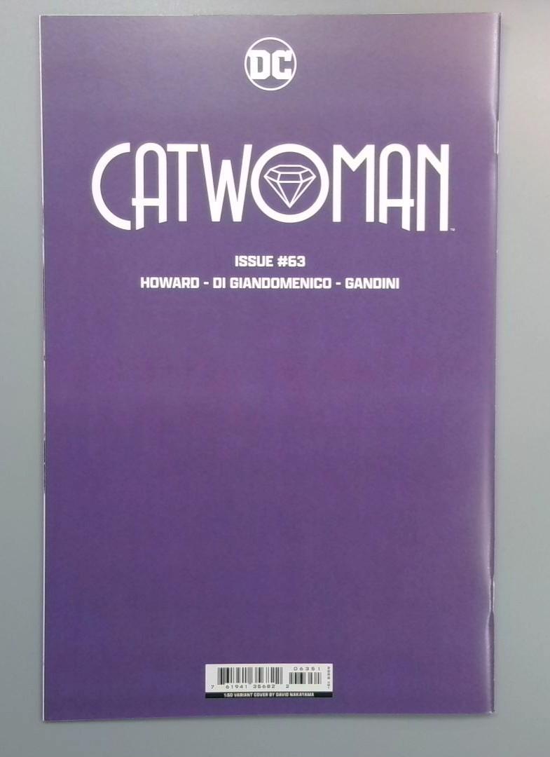 Catwoman #63 continues the "Nine Lives" storyline, part 5, featuring an underwater adventure with dynamic artwork by artist DNA. The issue follows the titular character in a purple costume, seemingly in a deep blue sea environment with shadowy hands reaching towards her. The cover showcases Catwoman in an energetic pose, mid-action, with a vibrant blue and purple color palette and bubbles surrounding her.