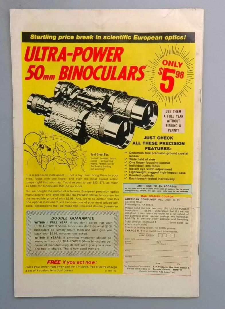 The issue also includes an advertisement for Ultra-Power 50mm binoculars, a vintage mail-order offer from American Consumer Inc., showcasing the type of product promotions commonly found in comics of this era.