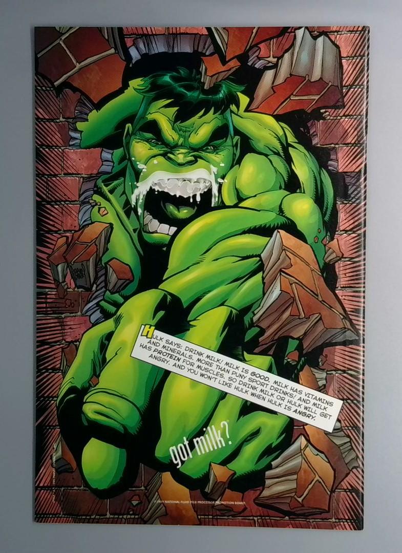 This dynamic cover showcases Daredevil in his classic red suit leaping across rooftops in Hell's Kitchen, with a striking cityscape backdrop illuminated by warm building lights. The interior features the Hulk in a memorable moment, with dialogue about milk and vitamins, capturing the raw energy and humor characteristic of this era of storytelling.