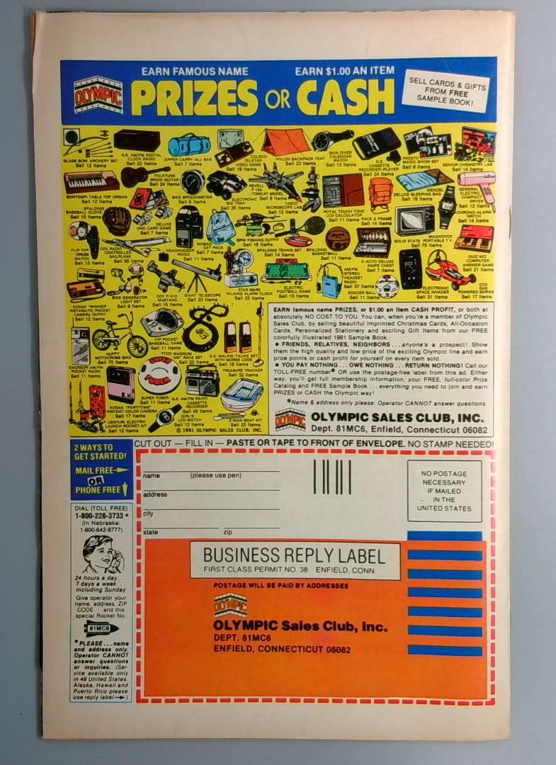 This copy includes an inserted back cover advertisement for Olympic Sales Club, Inc., offering prizes and cash incentives, which is typical of comics from this era.