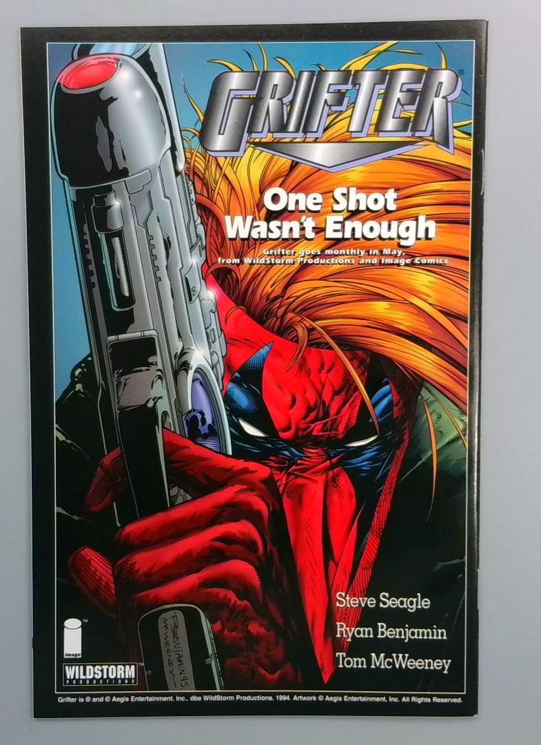 Deathblow #12 from Image Comics, featuring a dynamic cover by Chris Choi, Sale, and Scott. This issue showcases the character's intense, weaponized combat style with multiple guns and a large sword, set against a vivid pink and green background. The artwork emphasizes the character's muscular, heavily armed physique and aggressive posture. Grifter #1 from WildStorm Productions, a one-shot comic featuring a red-clad character wielding a large weapon. The cover by Steve Seagle, Ryan Benjamin, and Tom McWeeney highlights the intense, action-oriented nature of the character with a dramatic pose and striking color palette of reds and yellows.