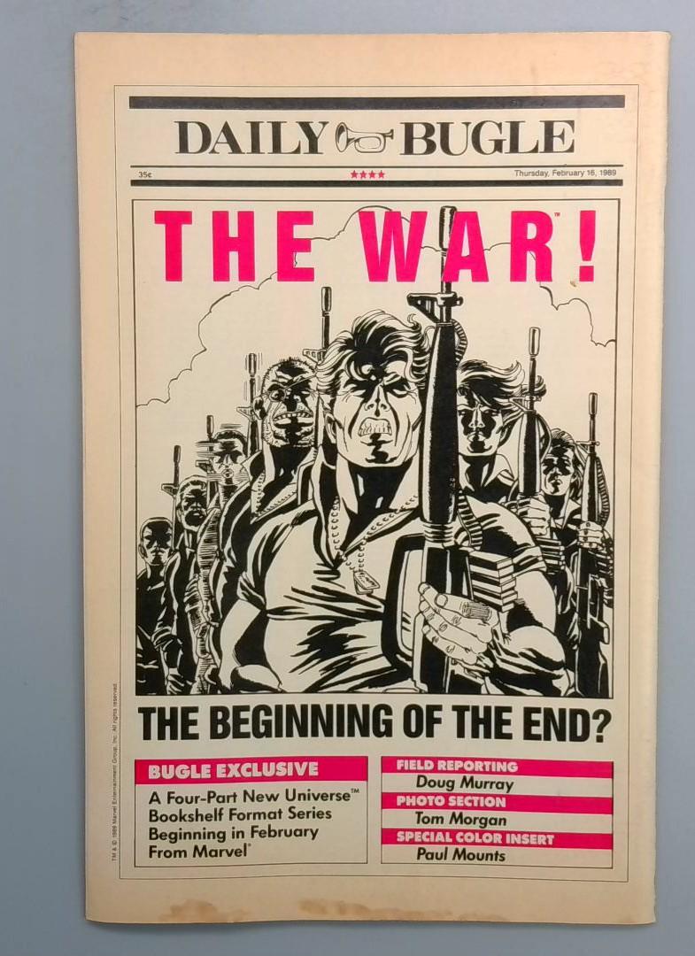 The back cover includes a Daily Bugle newspaper insert advertising "The War! The Beginning of the End?" promoting a four-part New Universe bookshelf format series beginning in February from Marvel, with field reporting by Doug Murray, photos by Tom Morgan, and a special color insert by Paul Mounts.