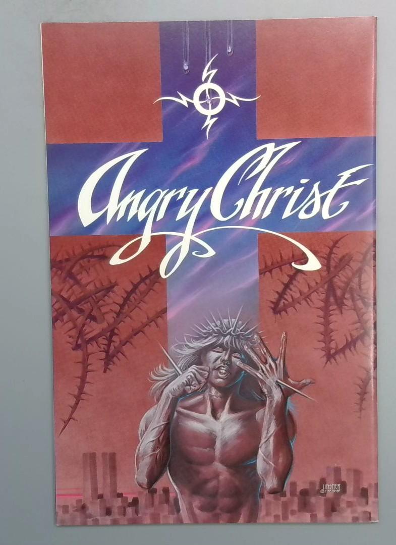 Angry Christ - A provocative title presented against a striking geometric design in red and blue tones. The cover features an intense central figure with spiky white hair, illustrated by Unther, with symbolic religious imagery including a cross and tribal-style design elements.