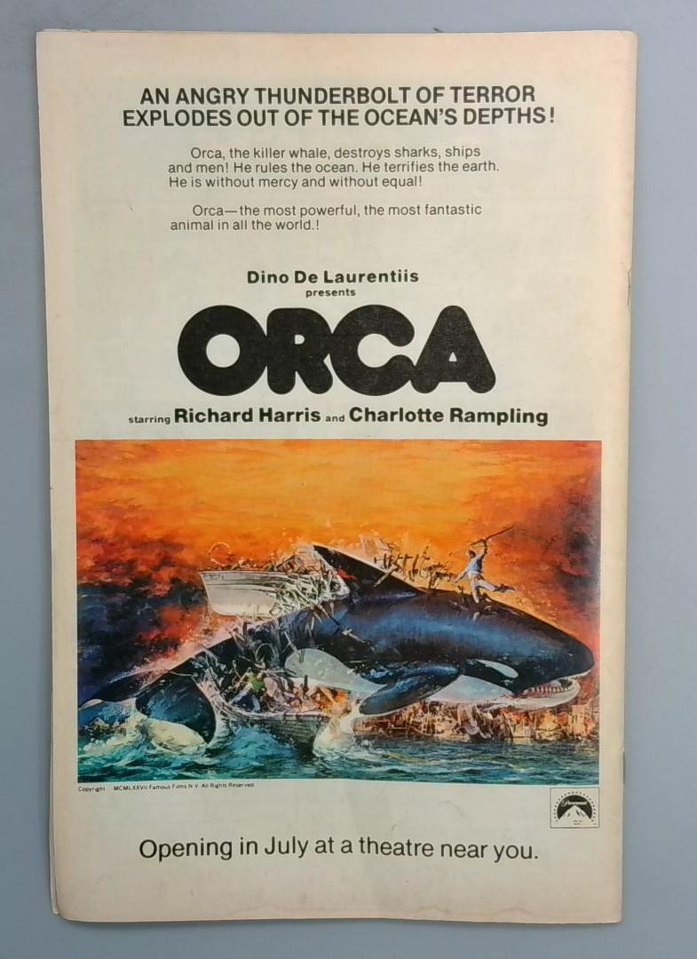 The cover includes a vintage advertisement for the 1977 film Orca, starring Richard Harris and Charlotte Rampling, which was a theatrical release promoted during this period.
