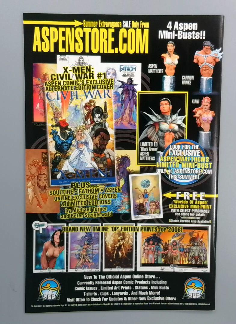 Michael Turner's Fathom #10 (September 2006) spotlights Aspen Matthews in a visually striking, ocean-powered adventure filled with supernatural currents and explosive action. Features vibrant Aspen Comics artwork and a dynamic full-color variant cover that echoes Turner's signature aesthetic. This copy includes the AspenStore.com promotional back cover, indicating it’s an AspenStore/retailer-exclusive variant edition.