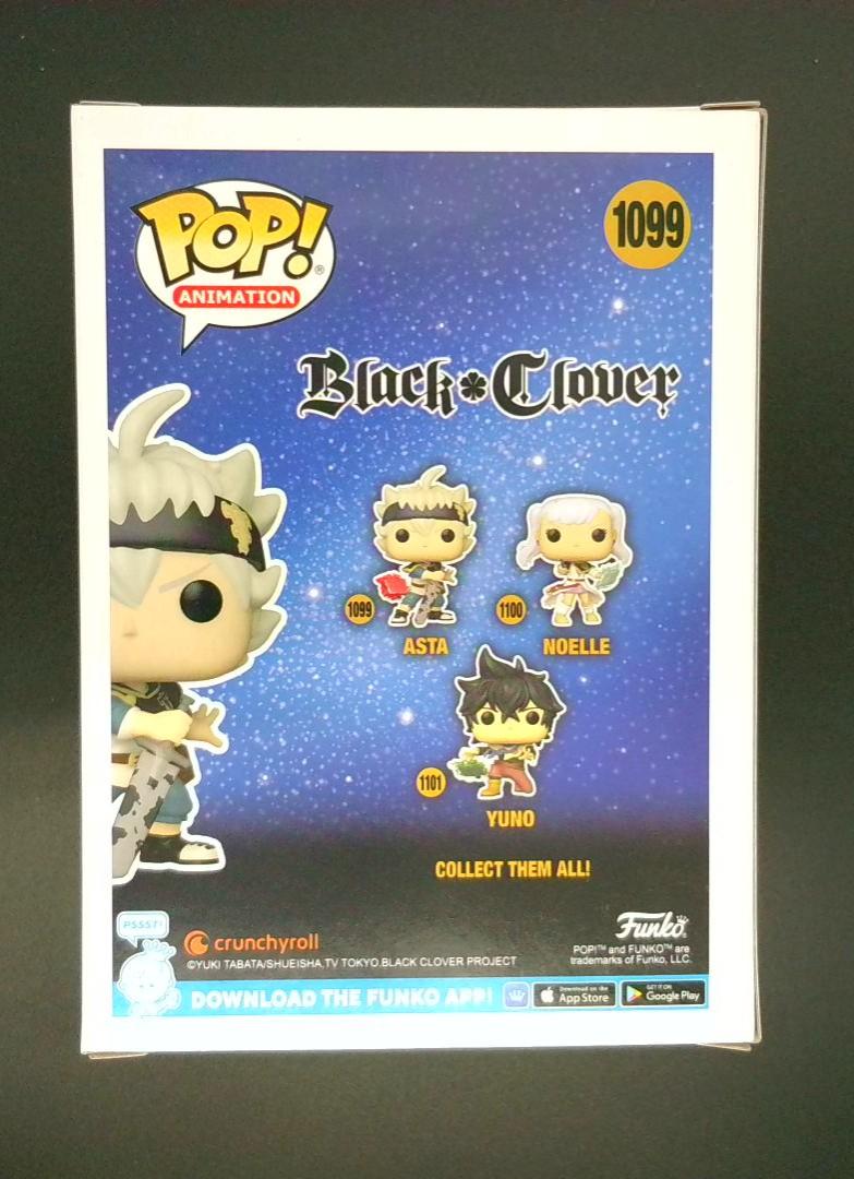 Funko Pop! Animation Black Clover #1099 featuring Asta in a dynamic pose, wielding a sword. The figure captures Asta's distinctive appearance with a stylized, chibi-like design, wearing his characteristic outfit in blue and white. The box is in excellent condition with clean, crisp edges and no visible damage. This vinyl figure showcases Asta's energetic stance, making it an appealing collectible for fans of the Black Clover series.