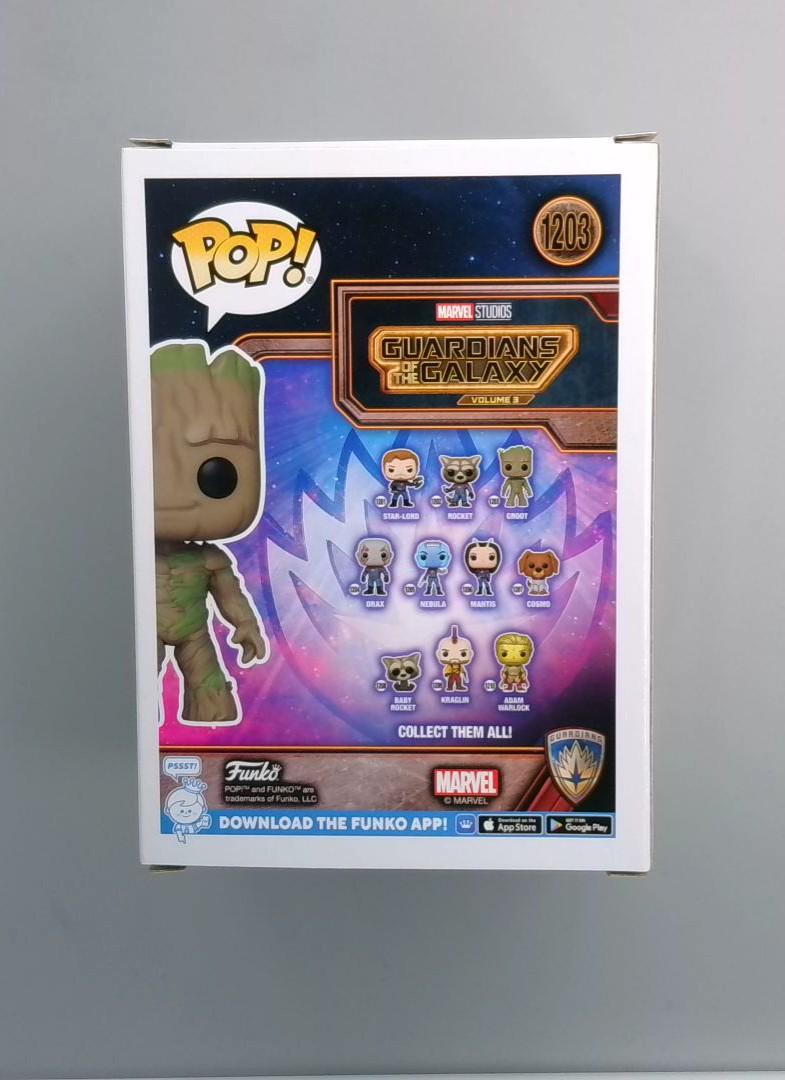 Funko Pop! Groot (1203) from Guardians of the Galaxy Vol. 3, featuring the tree-like character in a neutral standing pose with a wooden, textured appearance. The bobblehead figure is packaged in a near-mint condition box with clear window and vibrant Marvel Studios branding. Groot is rendered in a light green-brown color palette, capturing his distinctive organic form with simplified Funko Pop stylization. The collectible is part of the Marvel Studios line and appears to be in pristine, unopened condition.