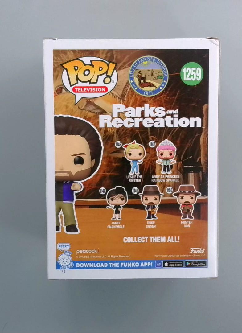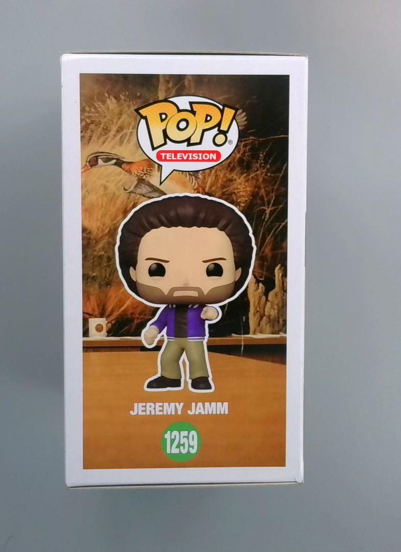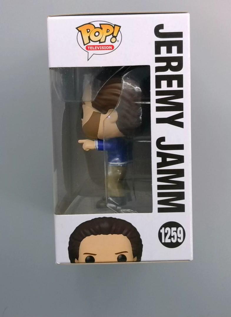 Funko Pop! vinyl figure of Jeremy Jamm from the popular TV series Parks and Recreation. This collectible is part of the Television line and is numbered 1259. It was a Summer Convention 2022 Limited Edition release, featuring Jeremy in his signature blue shirt and khaki pants. The figure captures the character's distinctive look from the comedy series.