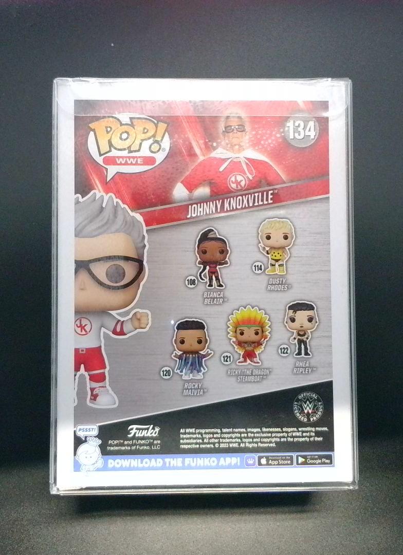 Johnny Knoxville #134 WWE Funko Pop featuring the character in his iconic red and white outfit with black-framed glasses. This is a 2023 Summer Convention Limited Edition exclusive release. The figure is in excellent condition with a clean, well-preserved box showing minimal wear. Perfect addition for WWE and Jackass fans alike.