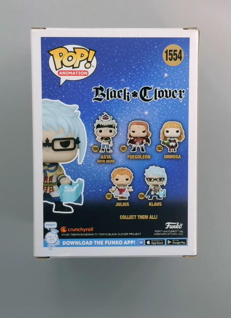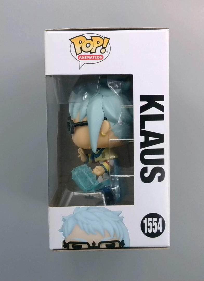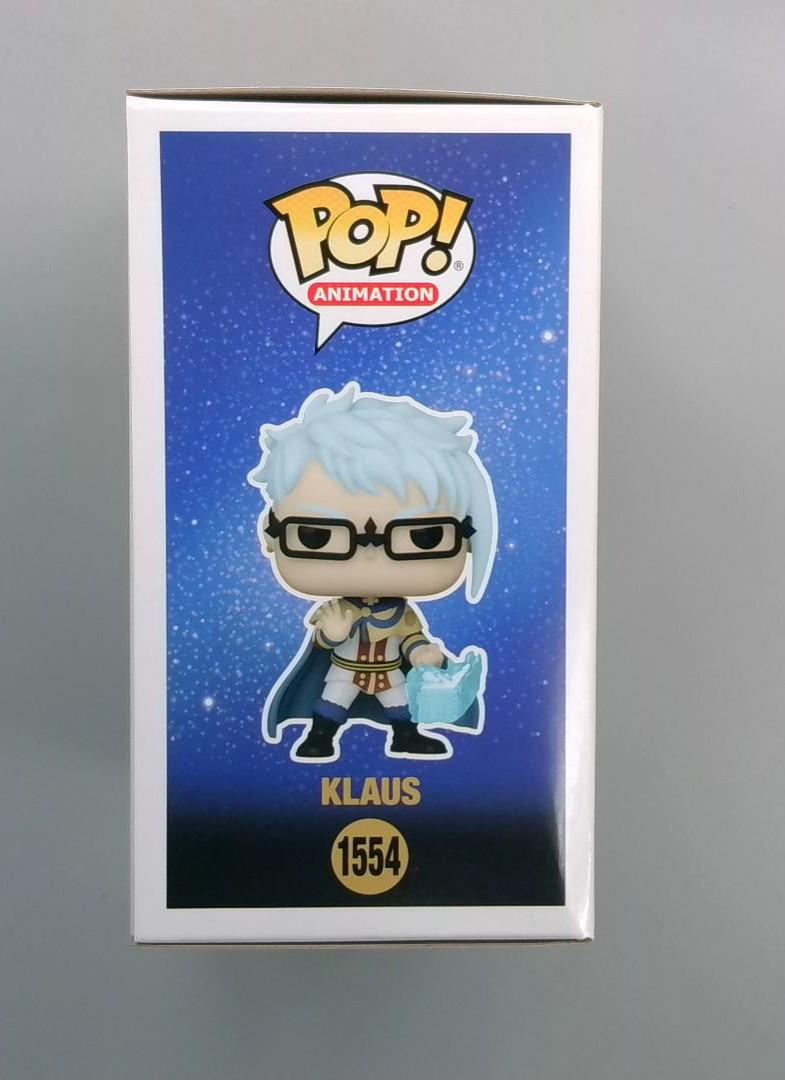 This is actually a Funko Pop! vinyl figure of Klaus from the anime series Black Clover, catalog number 1554 in the Animation line. The figure depicts Klaus with his distinctive blue-white hair, glasses, and a magical blue crystal or energy effect. Part of a collection that includes other Black Clover characters like Asta, Fuegoleon, and Mimosa, this collectible captures Klaus's unique character design from the popular magical anime series.