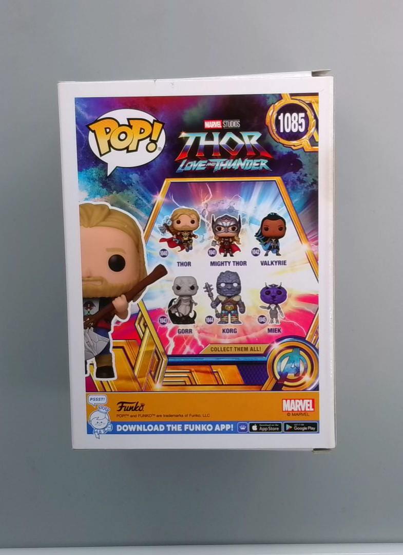 Ravager Thor Funko Pop from Thor: Love and Thunder, Entertainment Earth Exclusive (1085). Features a stylized Thor in a dynamic pose, holding a weapon. The figure captures the character's signature blonde hair and muscular build in the distinctive Funko Pop chibi style. Box appears to be in excellent condition with no visible damage, complete with all original packaging and exclusive sticker.
