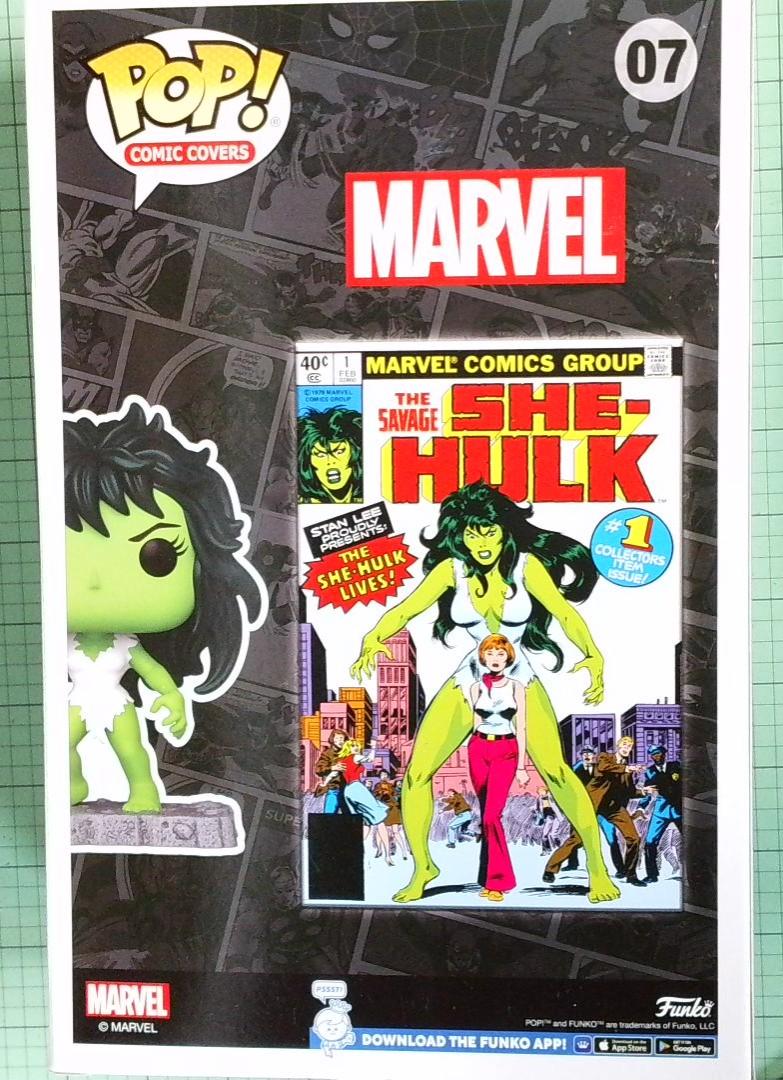 Funko Pop #07 featuring She-Hulk in her classic green form with black hair, posed in an aggressive stance. This Comic Covers exclusive showcases the character against the original Marvel Comics Group "The Savage She-Hulk" #1 cover art backdrop. Target exclusive release with bright lime green vinyl finish and white chest detail. Box is in excellent condition with minimal wear, displaying vibrant graphics and the iconic comic book cover design.