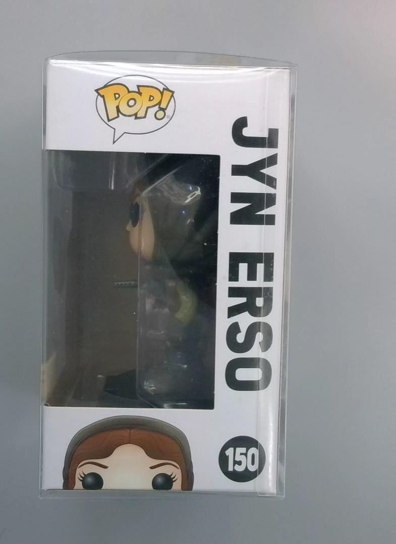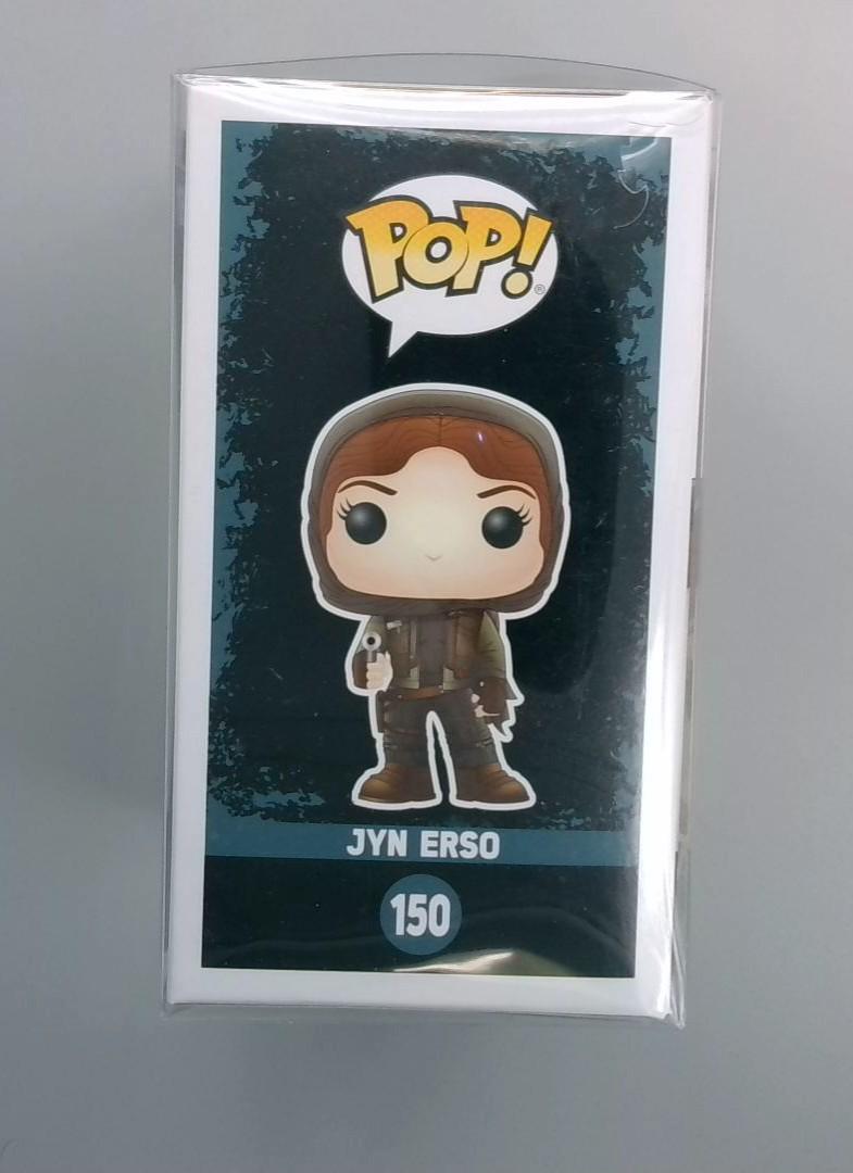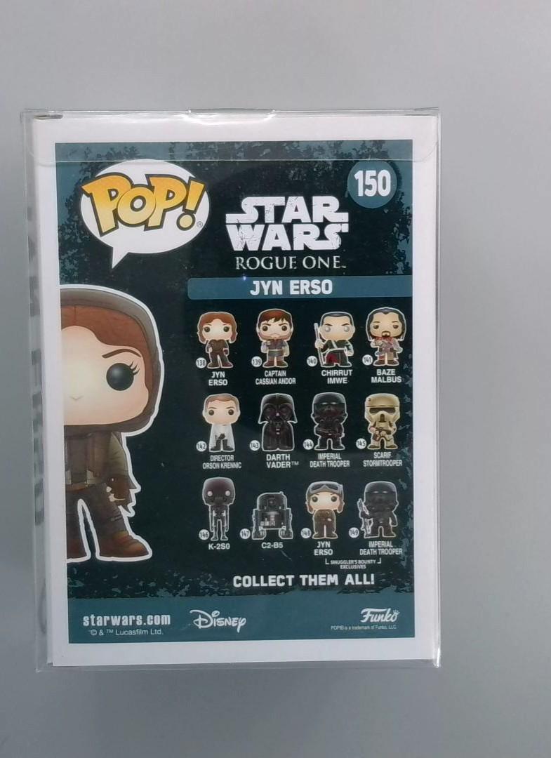 Funko Pop! vinyl figure of Jyn Erso from Star Wars: Rogue One, numbered 150 in the series. This Hot Topic exclusive collectible depicts the character in her military-style outfit from the film. The figure is part of a larger Star Wars Rogue One Pop! collection featuring characters like Cassian Andor, Chirrut Imwe, and Baze Malbus.