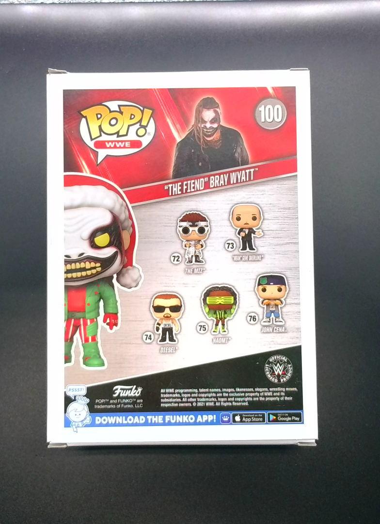 WWE Funko Pop #100 featuring "The Fiend" Bray Wyatt, a special Walmart exclusive with a glow-in-the-dark feature. The figure depicts a horrifying character with yellow eyes, a menacing grin, and a distorted face, wearing a red and green outfit with a white hat. The box is in excellent condition with minimal wear, and the figure is packaged in its original clear plastic packaging. This collectible showcases a unique, creepy interpretation of the WWE wrestler with striking visual details.