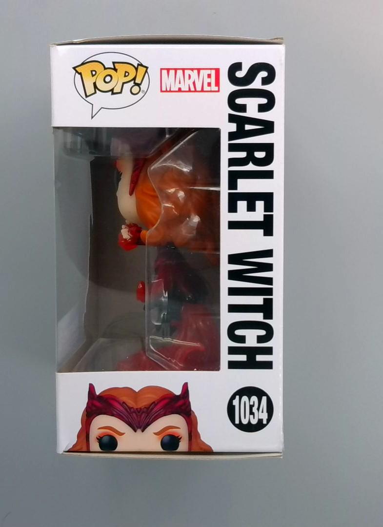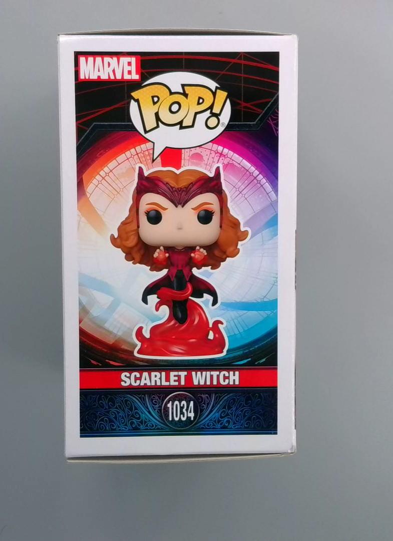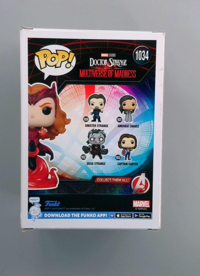 Funko Pop! vinyl figure of the Scarlet Witch from the Marvel Studios "Doctor Strange in the Multiverse of Madness" film. This collectible, numbered 1034, depicts the character in her iconic red costume with flowing hair and magical energy effects. The figure is a Walmart exclusive and part of the Funko Pop! Marvel line, showcasing the character's appearance from the multiverse-spanning superhero film. The packaging features additional characters from the movie, including Sinister Strange, America Chavez, Dead Strange, and Captain Carter.