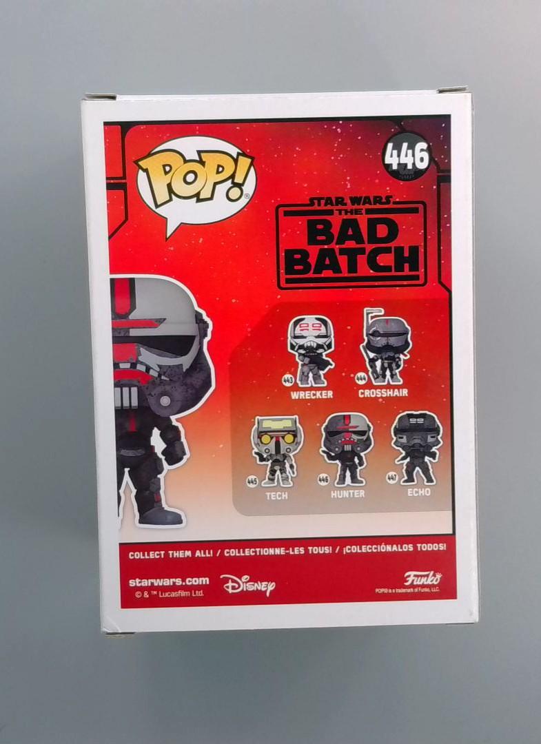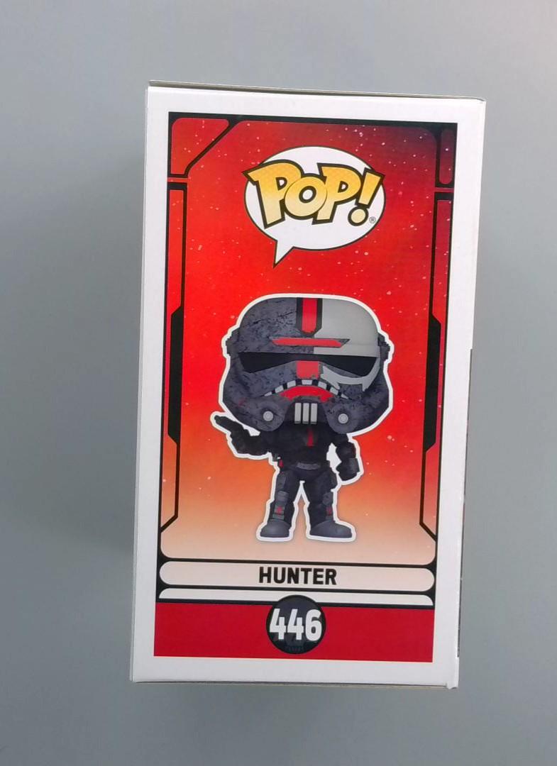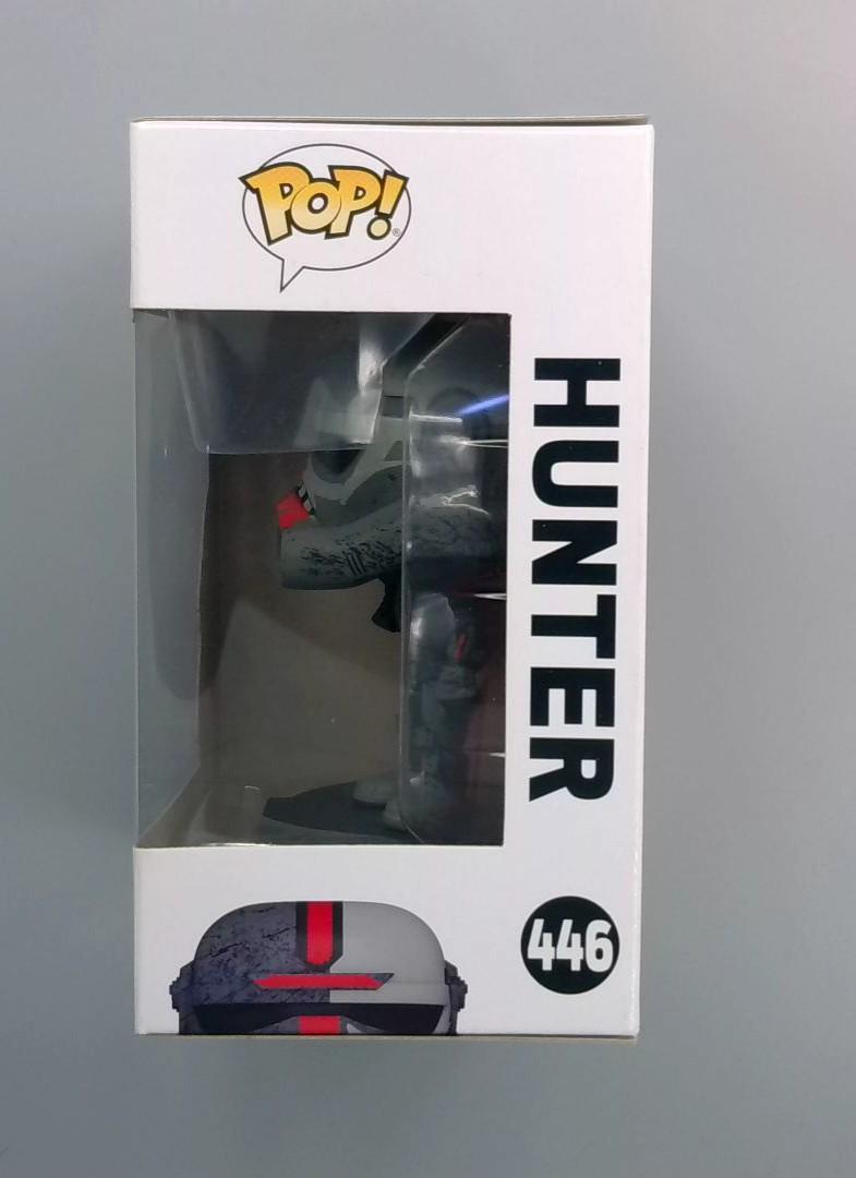 A Funko Pop! vinyl figure of Hunter from Star Wars: The Bad Batch, numbered 446 in the Star Wars collection. This stylized figurine depicts the clone trooper in his distinctive gray and red armor, capturing the unique design of the character from the animated series. Part of a set that includes other Bad Batch members like Wrecker, Crosshair, Tech, and Echo. The collectible comes in its original packaging with detailed character artwork and Star Wars branding.